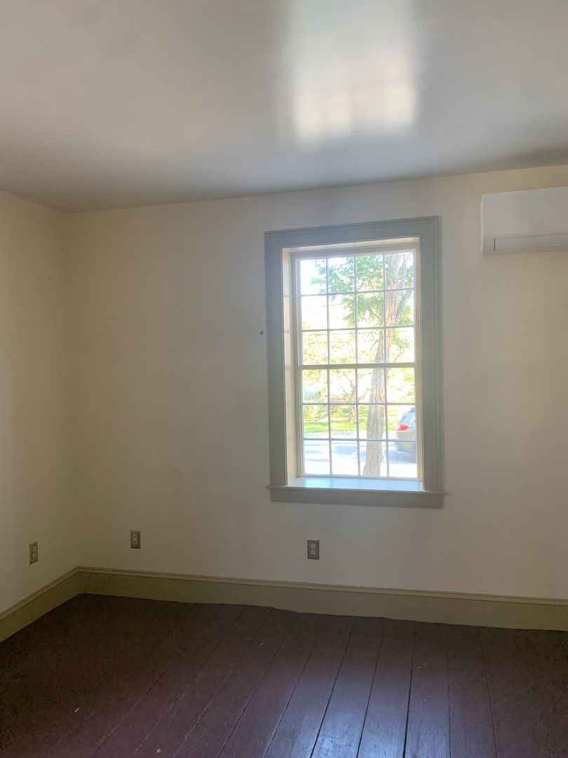 The large windows in this first floor, one-bedroom apartment complement the high ceilings and the rich, traditional wood floors located throughout the space. The living space is accentuated by an original brick hearth (not functioning) and mantle. Rooms have elegant, thoughtful lighting. The apartment includes energy-efficient appliances including a full-sized refrigerator, gas range with convection oven with a direct-vent overhead hood, and dishwasher. The kitchen features a deep stainless-steel sink with commercial-style faucet, and custom countertops and hardwood cabinets. The sparkling bathroom includes a large walk-in, custom-tiled shower with rainfall showerhead and hand sprayer, toilet, pedestal sink, and metal fixtures. There are a washer and a dryer within a closet inside the apartment. Modern, energy-efficient heat pumps provide warm, even heat in the colder months and cool air in the summer.