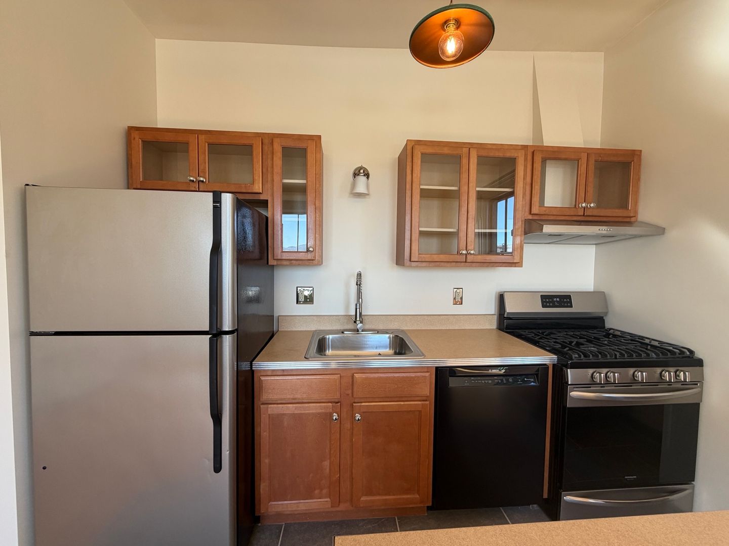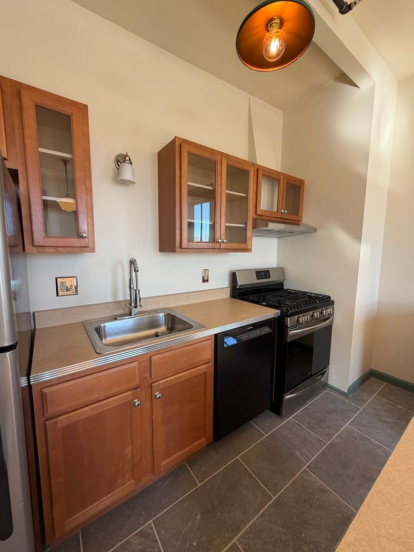 This 3rd floor one-bedroom apartment has high ceilings, large windows, and bamboo floors throughout. Wall sconces and soft pendant lights provide warm, inviting overhead light. The sunny open living room and kitchen layout offers flexibility with the space. The kitchen is accentuated by high-quality kitchen appliances with details that include full-sized stainless-steel finish refrigerator, gas range/oven with overhead hood, dishwasher, and stainless-steel sink with commercial-style sprayer. Glass panels on kitchen cabinet doors help you see exactly what you are looking for. Bedroom includes closet for your storage needs. Bath includes full-sized tub/shower and shelving to meet additional storage needs. This apartment comes with designated off-street parking for one vehicle in a nearby parking lot. Free laundry facilities available within the building.