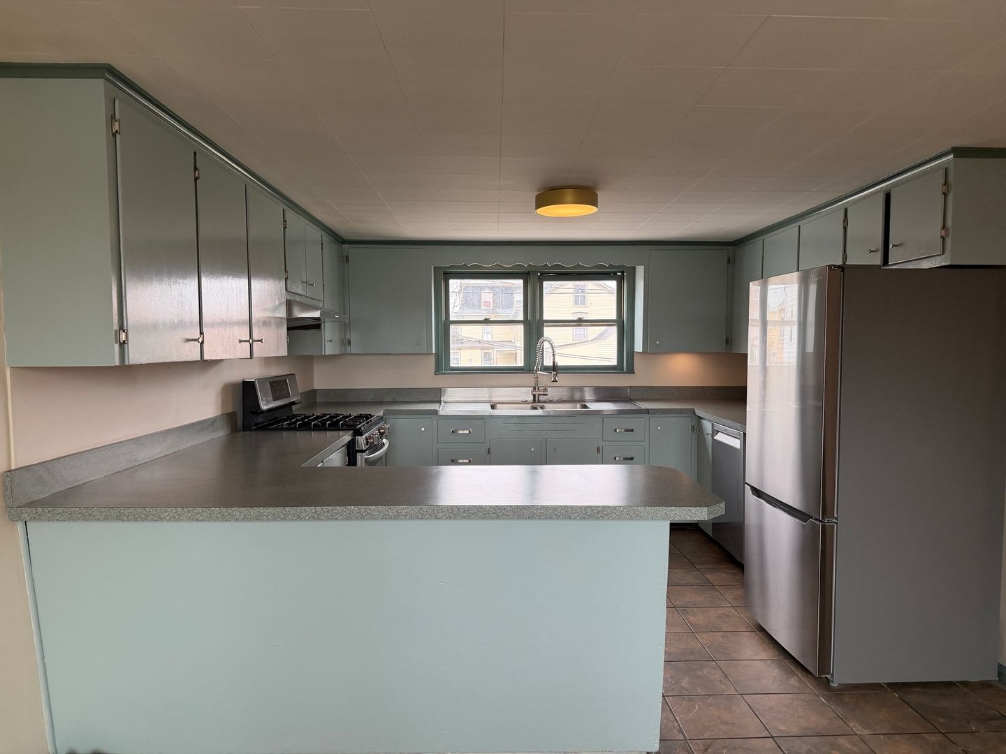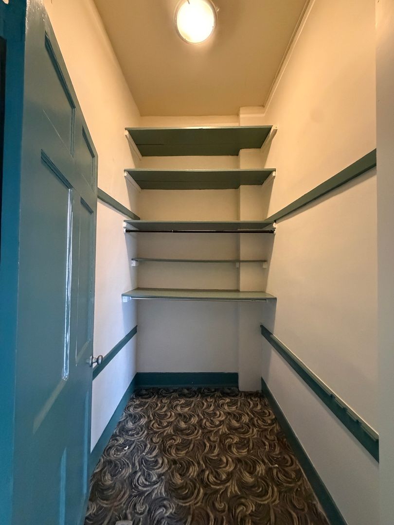 This large, sunny second-floor two-bedroom apartment features large windows, warm painted wood and bamboo flooring, and ceramic tile floors throughout. The apartment has warm, inviting lighting from the soft overhead and under-cabinet lighting and wall sconces. Built-in shelving in the living room and bathroom provide storage and display space. There is plenty of closet space, including two walk-in closets: one in the bathroom built-in shelving, and one off central hallway. Energy-efficient kitchen appliances include full-sized refrigerator, gas stove/oven, and overhead range hood. The large kitchen features a large two-bay stainless-steel sink with commercial-quality stainless faucet/sprayer hose, with lots of cabinet and countertop space. The spacious bathroom includes a tub with a shower surround and plenty of room for storage of personal items. There is a separate set of laundry appliances available for tenant use.