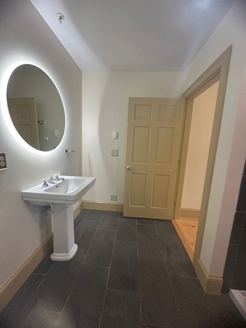 The large windows in this first floor, one-bedroom apartment complement the high ceilings and the rich, traditional wood floors located throughout the space. The living space is accentuated by an original brick hearth (not functioning) and mantle. Rooms have elegant, thoughtful lighting. The apartment includes brand-new, energy-efficient appliances including a full-sized refrigerator, gas range with convection oven with a direct-vent overhead hood, and dishwasher. The kitchen features a deep stainless-steel sink with commercial-style faucet, new countertops, and new custom hardwood cabinets. The sparkling new bathroom includes a large walk-in, custom-tiled shower with rainfall showerhead and hand sprayer, toilet, pedestal sink, and metal fixtures. There is also a brand-new washer and dryer within a closet inside the apartment. Modern, energy-efficient heat pumps provide warm, even heat in the colder months and cool air in the summer.